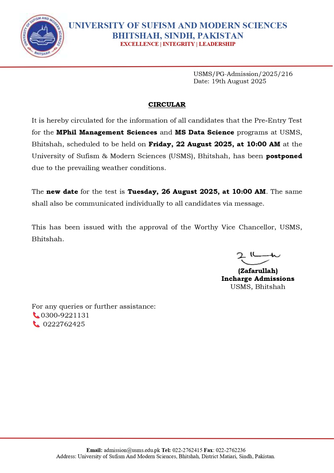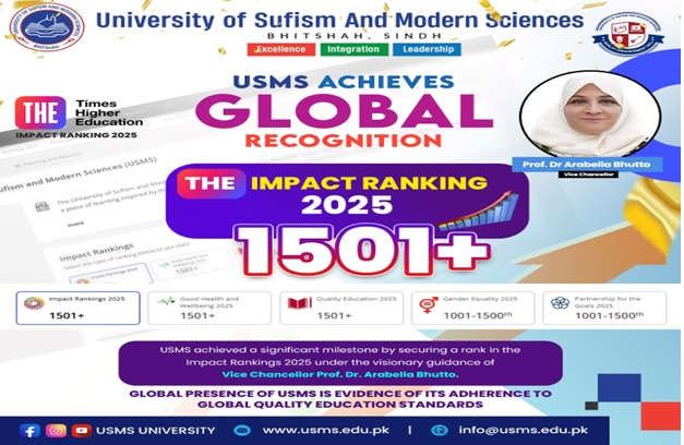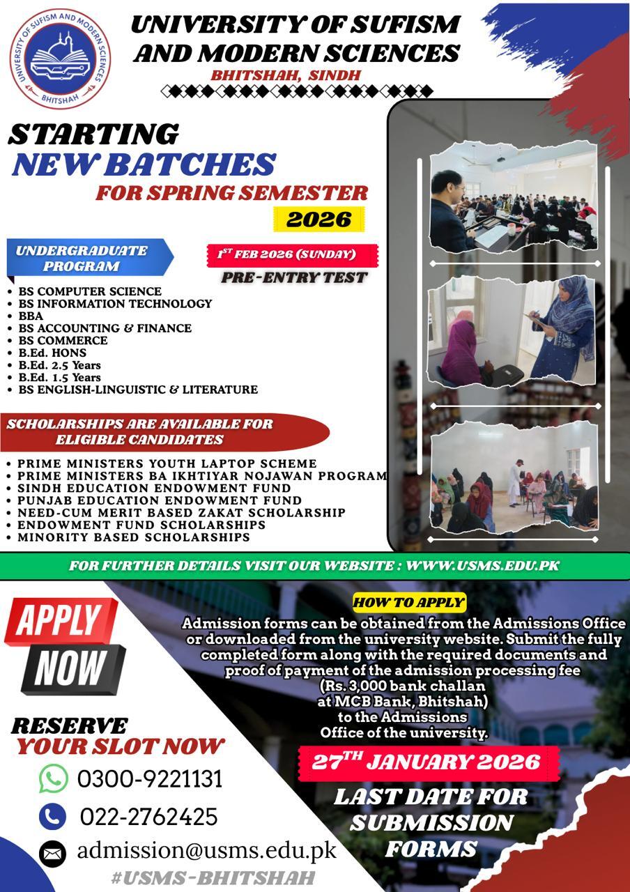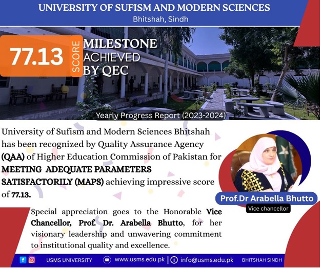 The University of Sufism and Modern Sciences (USMS) is situated in Bhitshah Town, Matiari District, home to a Shrine of the Sufi Saint HazratShah Abdul Latif Bhittai.