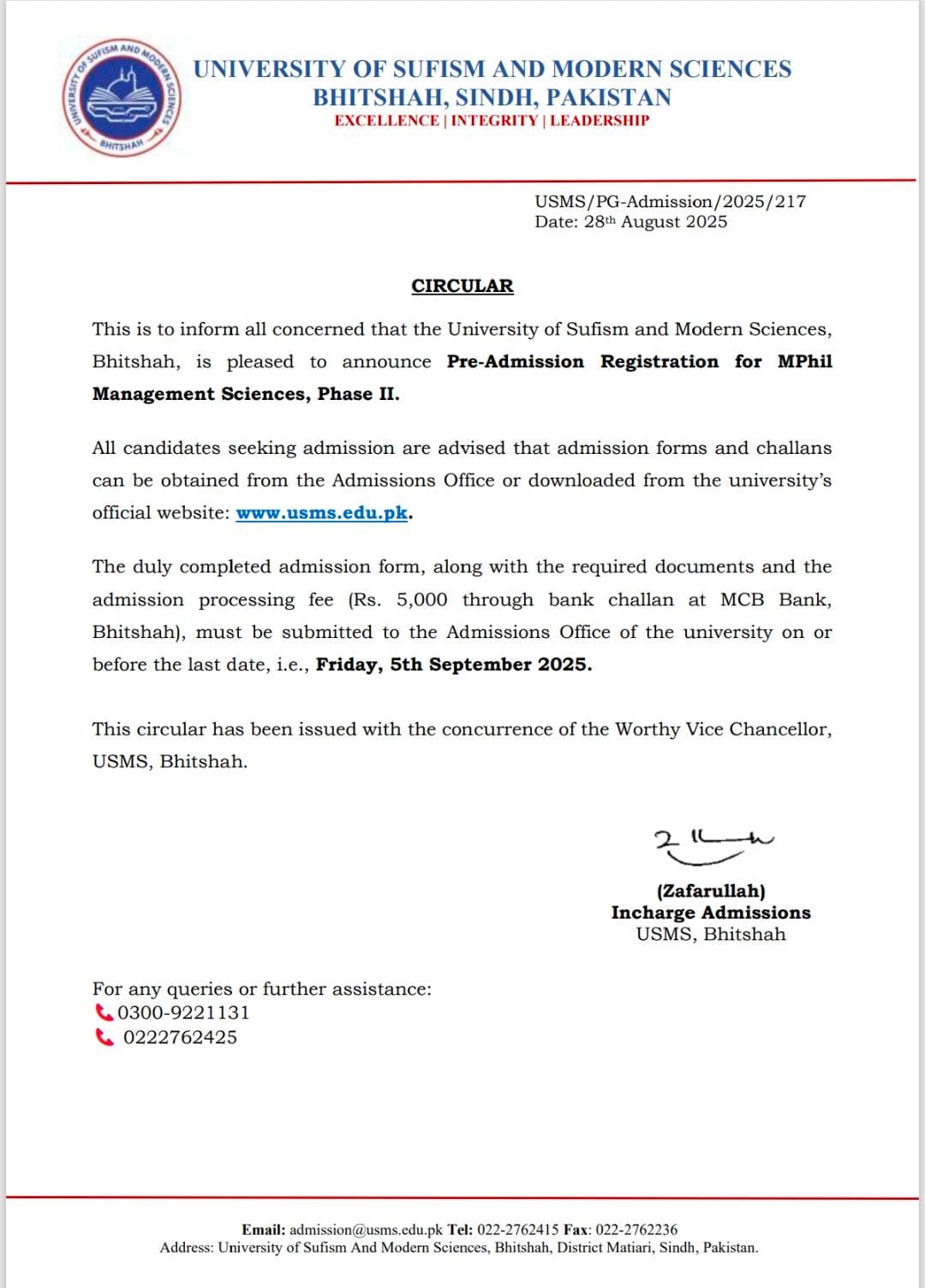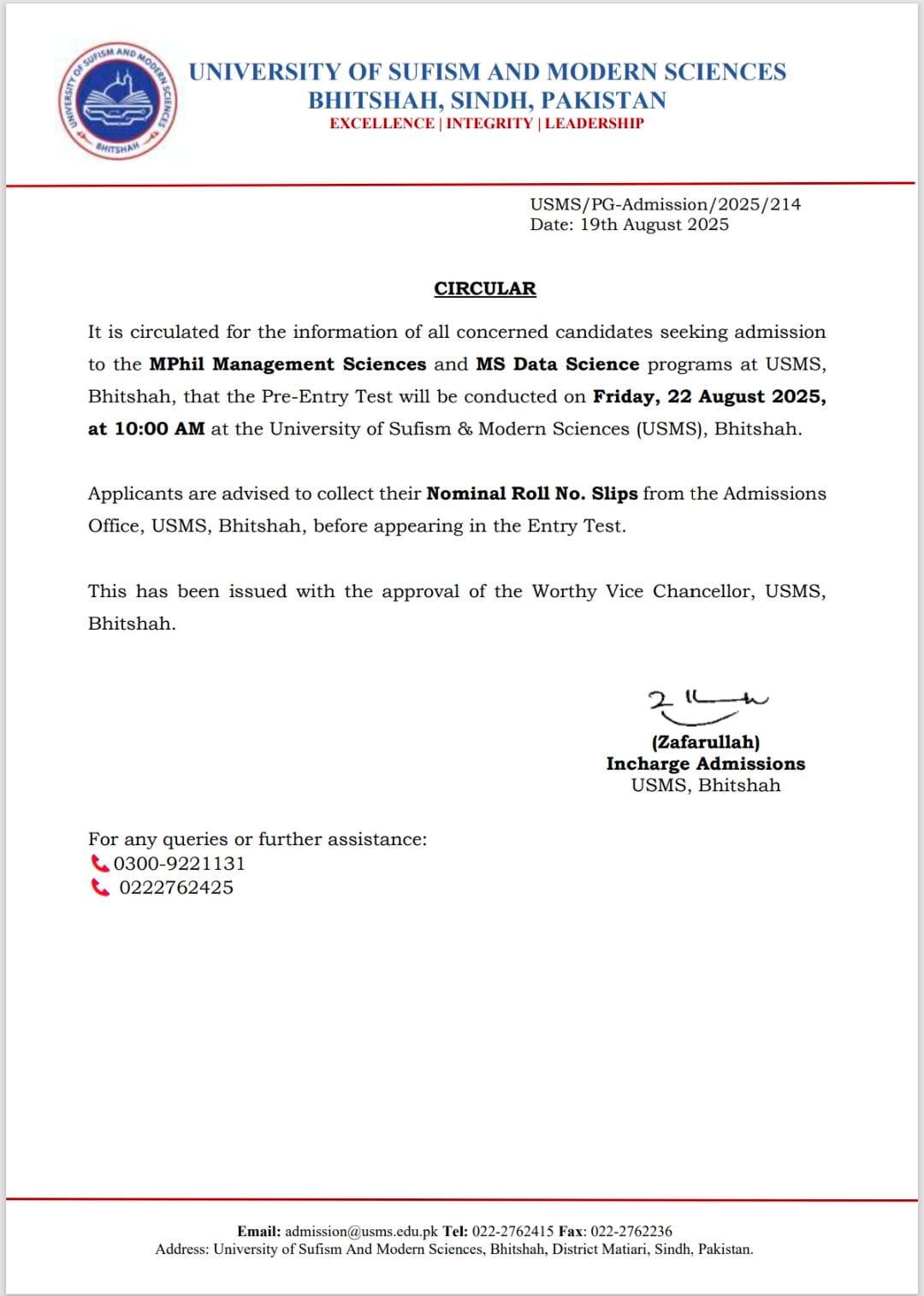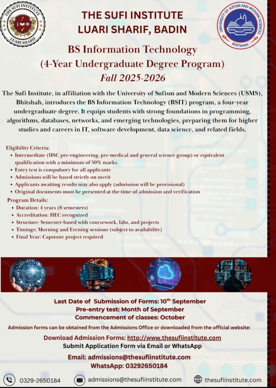 The University of Sufism and Modern Sciences (USMS) is situated in Bhitshah Town, Matiari District, home to a Shrine of the Sufi Saint HazratShah Abdul Latif Bhittai.